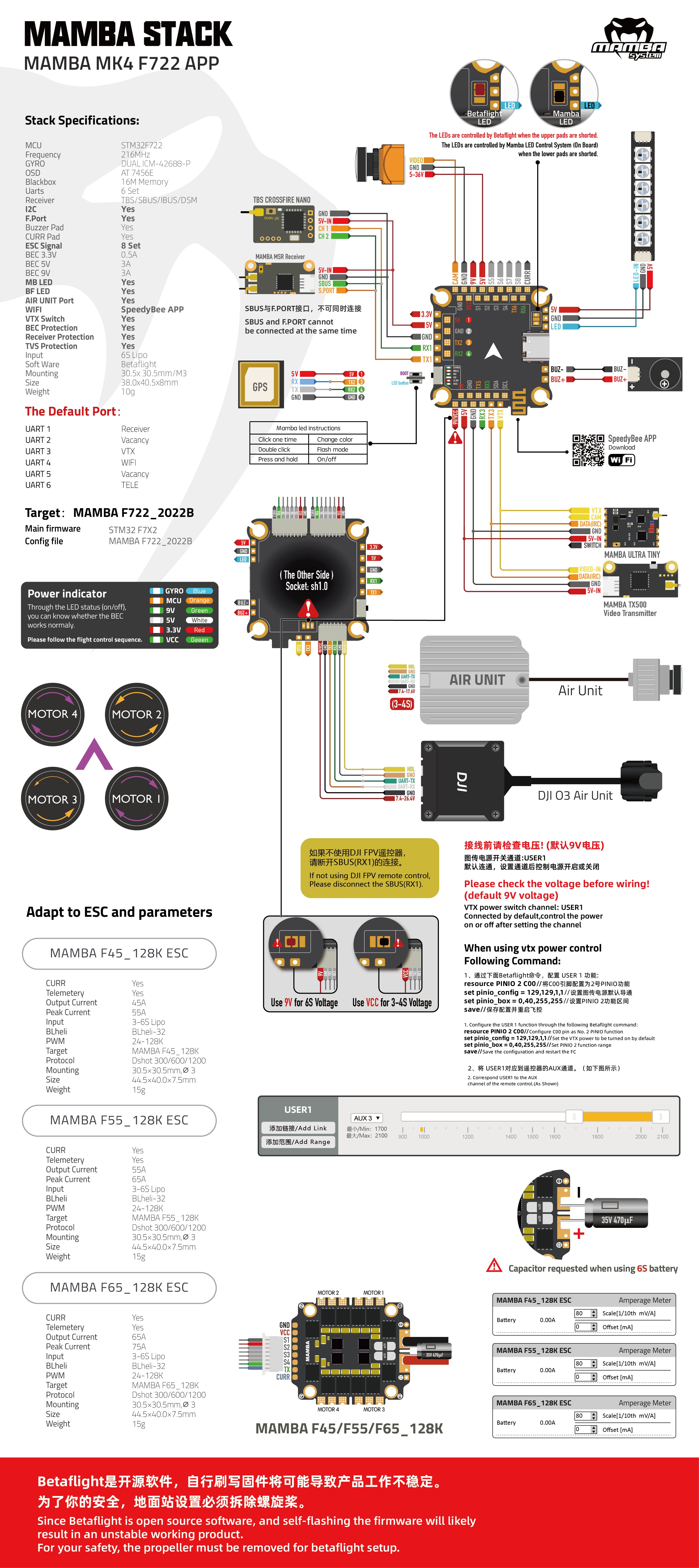 The Diatone Mamba MK4 is an F722 flight controller. With WiFi capabilities through the SpeedyBee APP, this stack is the perfect addition to your FPV build. This version has an IMC42688P Gyro.