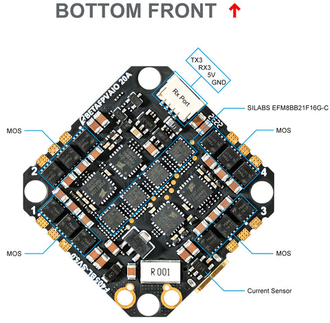 Nota: El F405 4S 20A FC V5 está disponible para flashear el firmware de ESC BLHeli_S y BLUEJAY y viene con el firmware BLUEJAY predeterminado. La principal diferencia es que el firmware BLUEJAY admite D-shot bidireccional, mientras que BLHeli_S no lo admite.