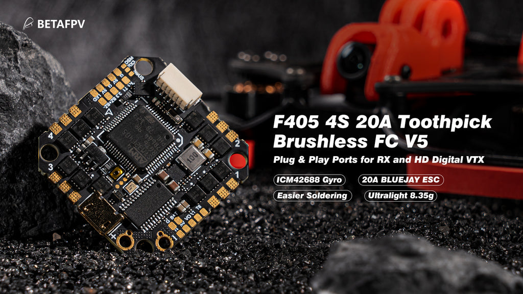 Basado en el controlador de vuelo sin escobillas F405 2-4S 20A V4, el controlador de vuelo sin escobillas F405 4S 20A Toothpick V5 aplica un nuevo chip de ESC y giroscopio ICM42688 que viene con el firmware ESC BLUEJAY, por lo que admite D-shot bidireccional. Además de los puertos plug&play para el receptor y HD Digitial VTX al igual que la placa V4, la placa V5 está hecha con un diseño racional para facilitar la soldadura y evitar que la soldadura salte a otra almohadilla y provoque cortocircuitos en los componentes.