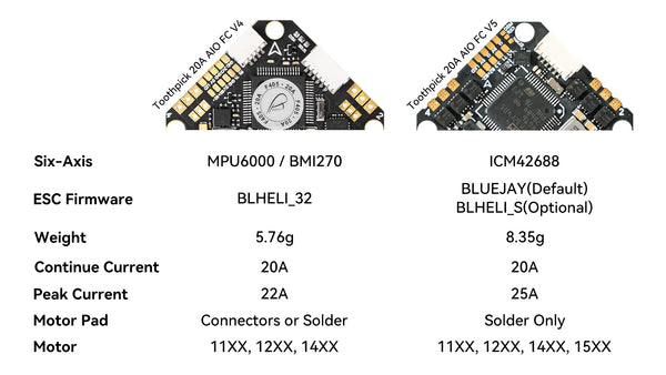 Hemos actualizado el La placa F405 2-4S 20A V4 se convirtió en V5 adoptando el giroscopio ICM42688 en lugar del MPU6000 y agregando algunas características nuevas. El giroscopio ICM42688 funciona muy bien en la mayoría de los casos. A excepción del giroscopio, la placa V5 viene con un firmware ESC completamente nuevo que admite D-shot bidireccional. La forma de conectar los motores cambió y solo se puede soldar en la placa V5. Además, la placa V5 FC cuenta con material de alta calidad para lograr estabilidad y durabilidad. Las siguientes imágenes muestran la diferencia entre los dos controladores de vuelo.