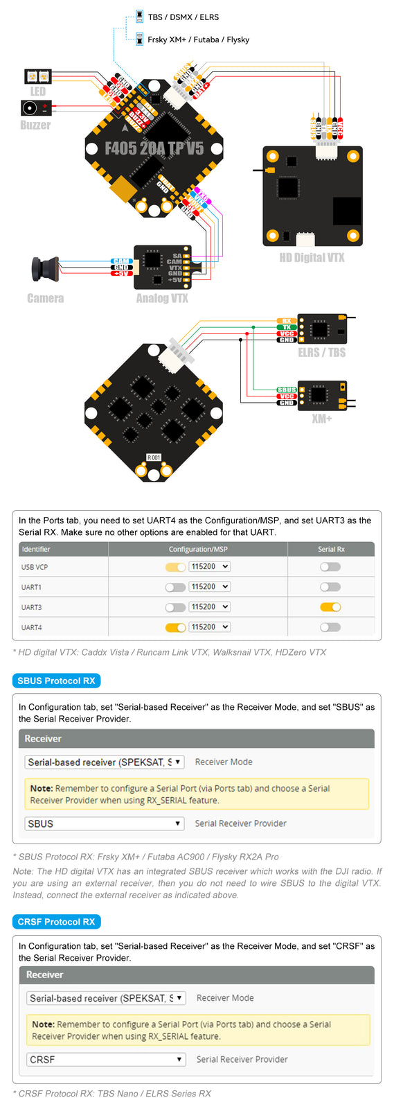 El F405 4S 20A FC V5 integra el puerto Plug & Play para el receptor externo RX y el VTX digital HD, y habrá un conector de 4 pines para el receptor RX y un conector de 6 pines para el VTX digital HD en el paquete. Por lo tanto, recomendamos encarecidamente a los pilotos que utilicen el puerto para ahorrarse el trabajo de soldadura.