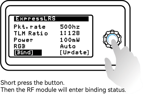 Le module Micro RF TX est livré avec le protocole officiel de version majeure V1.1.0 ou V2.0.0 et aucune phrase de liaison n'est incluse. Veuillez donc vous assurer que le récepteur fonctionne avec le protocole officiel de version majeure V1.0.0~V1.1.0 ou V2.0.0. Et aucune phrase de liaison n'est définie. Le module Micro RF TX peut entrer dans l'état de liaison via le script ELRS.lua ou ELRSV2.lua, comme décrit dans le chapitre « Script LUA ». De plus, à l'aide du bouton et de l'OLED, passez à la position BIND et appuyez longuement sur le bouton. Appuyez brièvement sur le bouton s'il s'agit de la version V2.0.0. Le module RF entrera alors dans l'état de liaison.