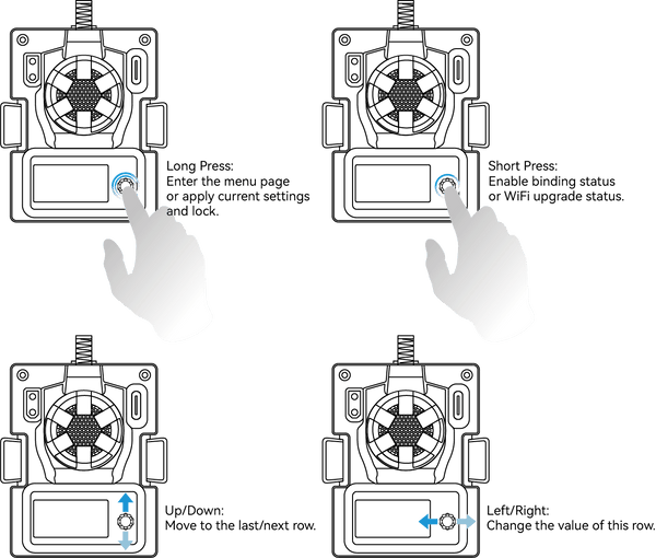 Remarque : toutes les dimensions des boutons 5D sont disponibles sur le micrologiciel BETAFPV ELRS V2.0.0. Veuillez mettre à jour le micrologiciel pour bénéficier de nouvelles fonctionnalités.