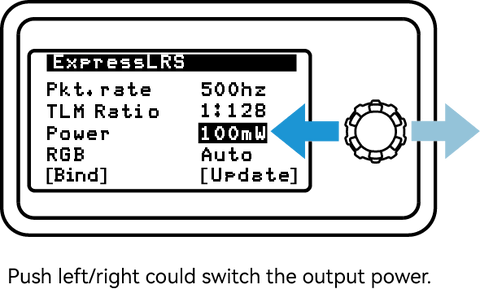 Le module Micro RF TX peut commuter la puissance de sortie via le script ELRS.lua ou ELRSV2.lua, comme décrit dans le chapitre « Script LUA ». De plus, à l'aide du bouton et de l'OLED, passez à la position de sortie. Commutez la puissance de sortie en appuyant longuement sur le bouton (script ELRS.lua). Poussez le bouton vers la gauche ou vers la droite (script ELRSV2.lua).