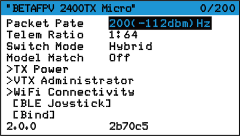 Vous pouvez tous utiliser le firmware officiel ELRS V2.0-RC2 maintenant, mais vous perdez la fonction OLED et le joystick. Nous travaillerons avec l'équipe de développement ELRS et ferons en sorte que le firmware officiel ELRS prenne en charge toutes les fonctions du module Micro TX. Pour l'étape suivante, OLED sera officiellement pris en charge dans la version V2.1.